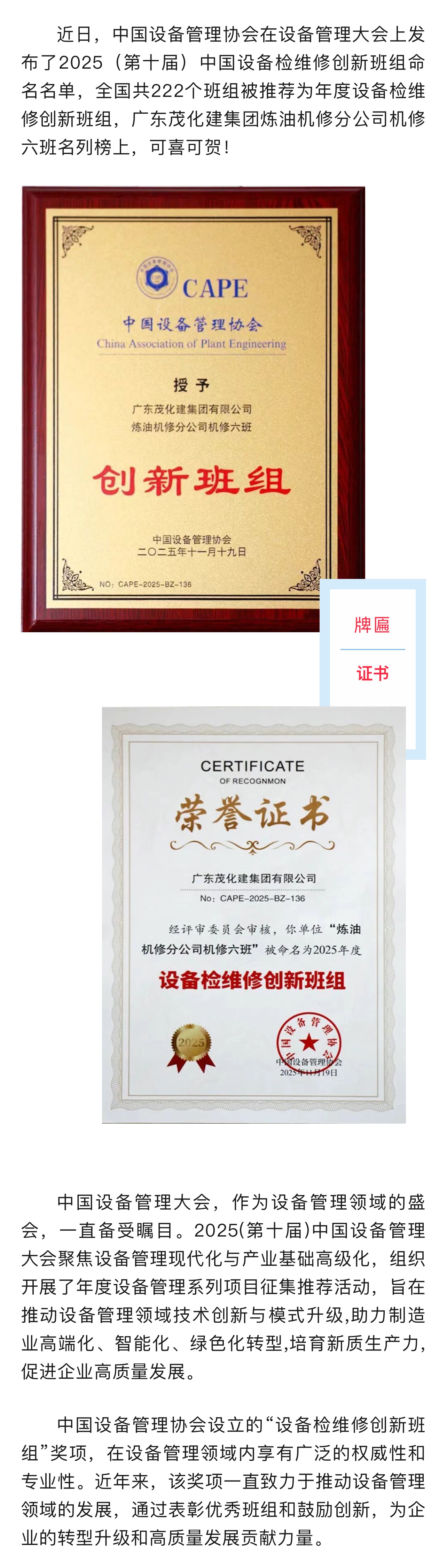 喜報(bào) | 煉油機(jī)修六班榮獲全國(guó)”設(shè)備檢維修創(chuàng)新班組“稱號(hào)