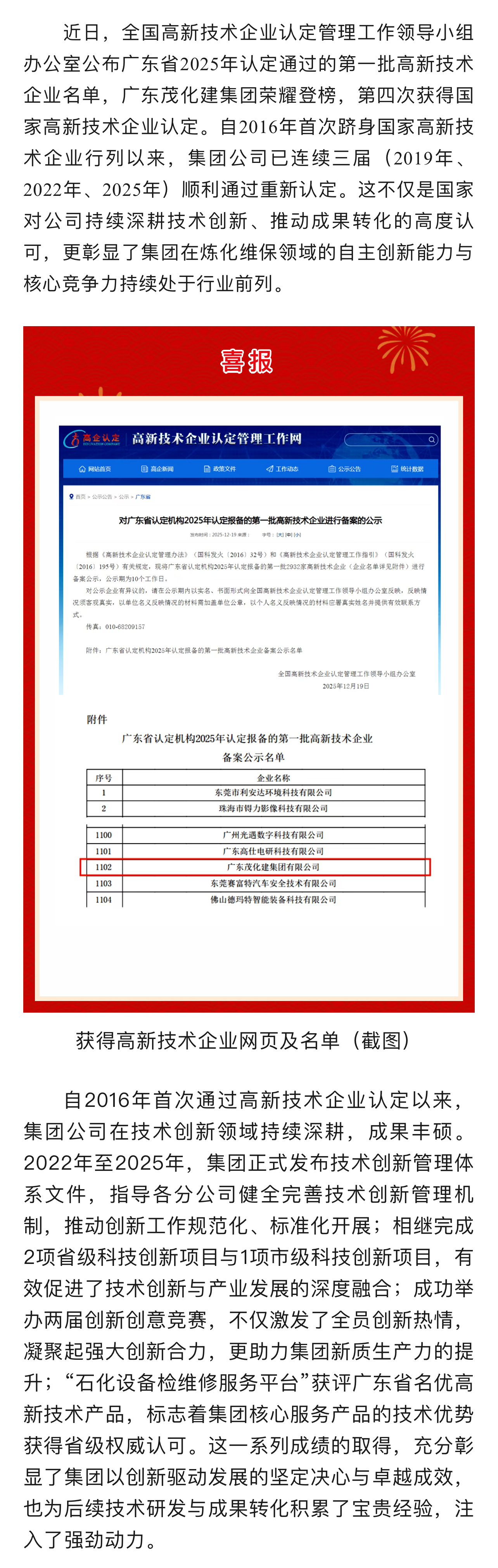 喜報(bào) | 廣東茂化建集團(tuán)再通過高新技術(shù)企業(yè)認(rèn)定